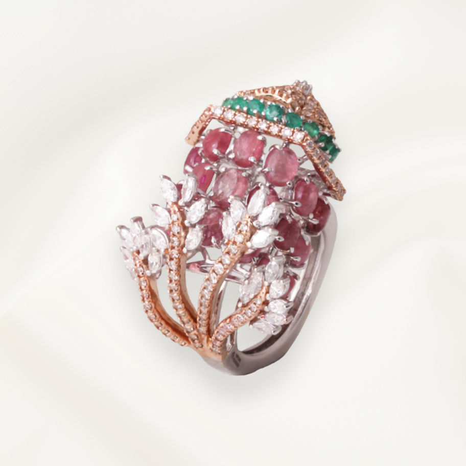 Discover the Catana Diamond Ring, a masterpiece that embodies the excellence Valoré is known for. This one-of-a-kind ring showcases a beautiful blend of coloured stones and natural diamonds, making it a stunning statement piece for special occasions. Crafted with meticulous attention to detail, the Catana Diamond Ring offers both timeless elegance and a unique charm. Embrace the allure of a truly extraordinary piece, perfect for celebrating life's most memorable moments.