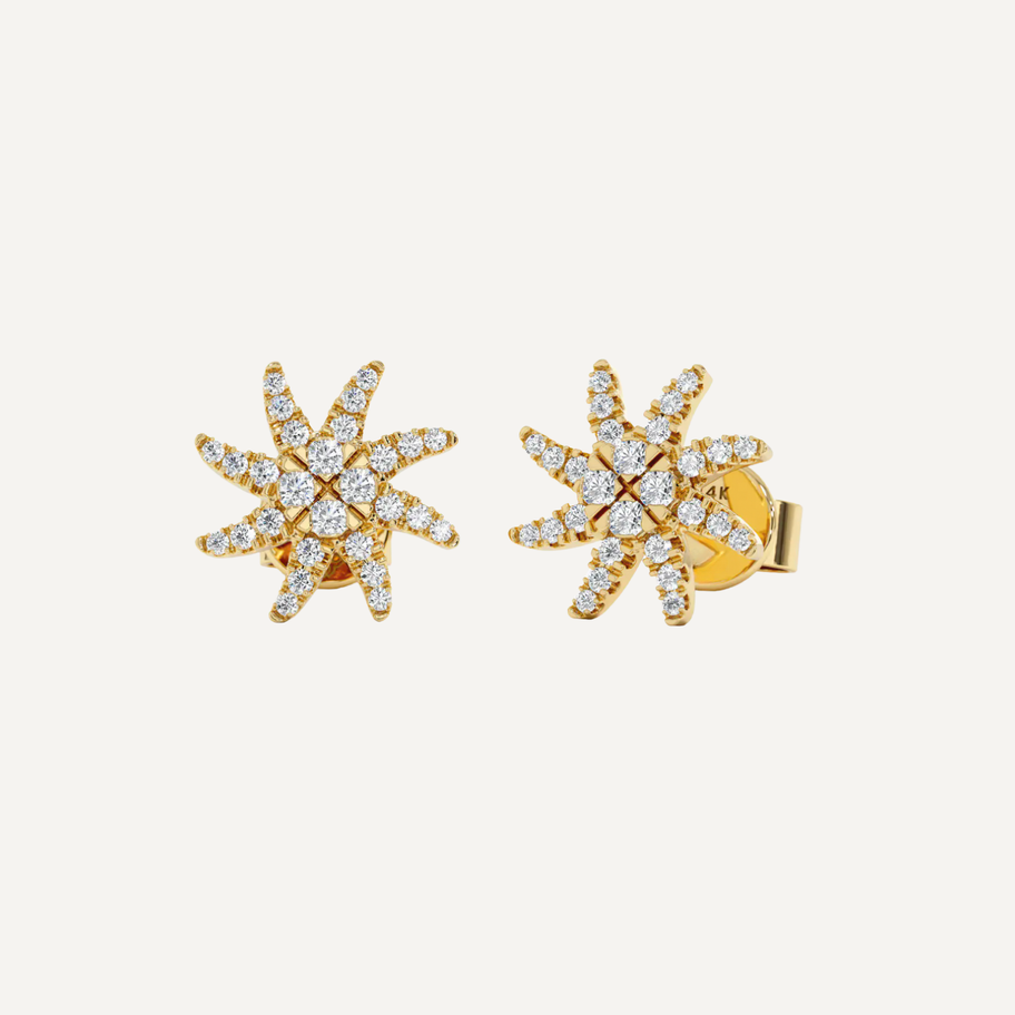 A subtle nod to nature's brilliance, these delicate studs bring together the warmth of sunlight and the whimsical grace of a starfish. Crafted in your choice of yellow, white, or rose gold, each stud is adorned with radiant diamonds that catch the light from every angle. Whether you're dressing up or down, these timeless accents lend a touch of golden glow to your everyday elegance.