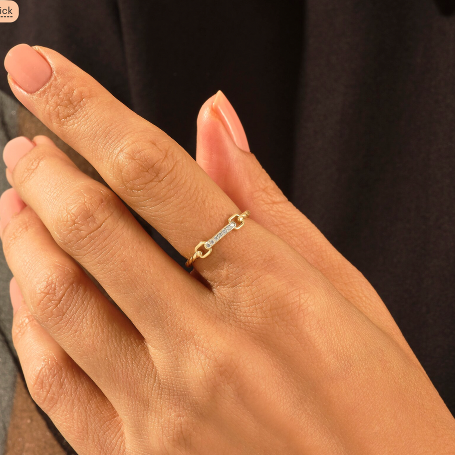 A study in modern symmetry, this striking ring features two open gold frames poised in perfect harmony, linked by a constellation of diamonds that glimmer like stardust suspended in motion. The interplay of structure and sparkle creates a refined architectural feel - bold, yet graceful. Each diamond is placed with care, bridging the golden forms with a luminous thread of light.