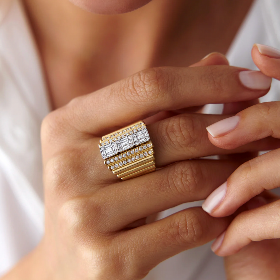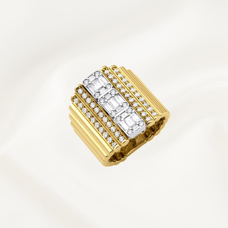 This opulent diamond ring is truly fit for a queen, designed to make a grand statement with its bold and textured elegance. Covering approximately one-third of the finger, this striking piece exudes luxury and sophistication. The intricate design, set with natural diamonds, creates a stunning visual texture that reflects light from every angle, ensuring all eyes are on you.
